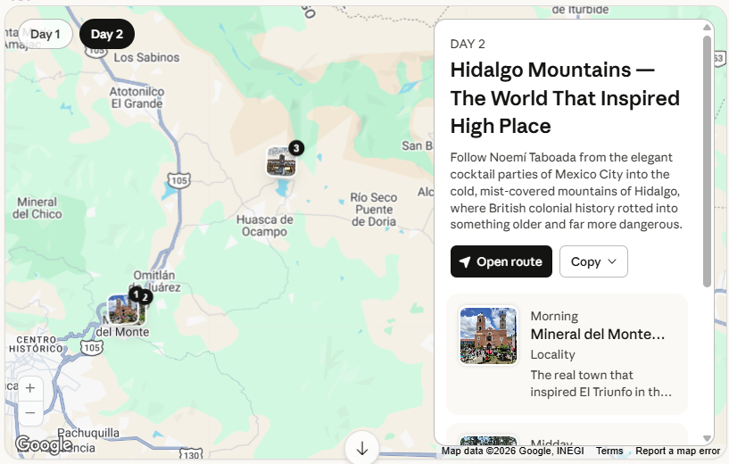 Mineral del Monte (Real del Monte) — The real town that inspired El Triunfo in the novel, perched high in the mountains of Hidalgo, cold, misty, and scarred by centuries of colonial silver mining. The British mining history earned it the nickname Little Cornwall, and its slanted English-style roofs are still a dead giveaway. This is where the novel lives, geographically and spiritually. Visit on a foggy morning and the book will make perfect, horrible sense.