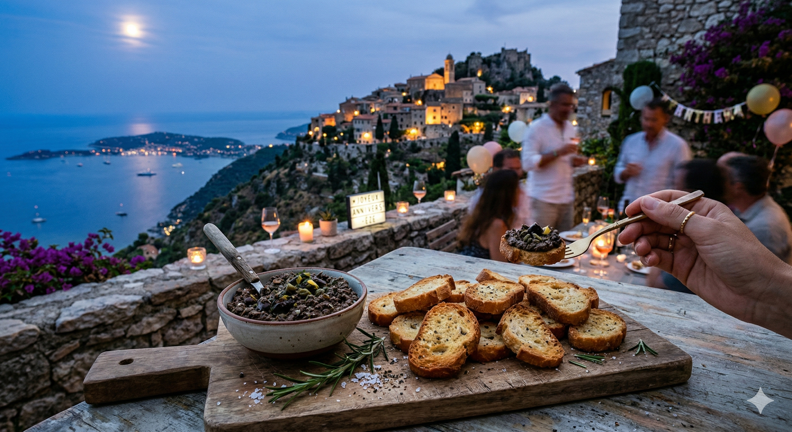 Tapenade & Crostini: A sharp, salty olive spread that mirrors the “salty” tension of the birthday party at the cliffside village of Èze.