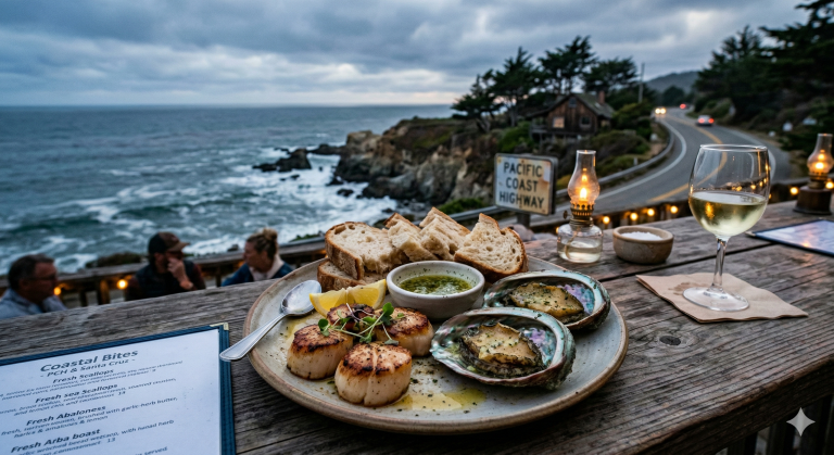 Fresh Abalone or Scallops: Inspired by the stops along the Pacific Coast Highway and the safe house in Santa Cruz.