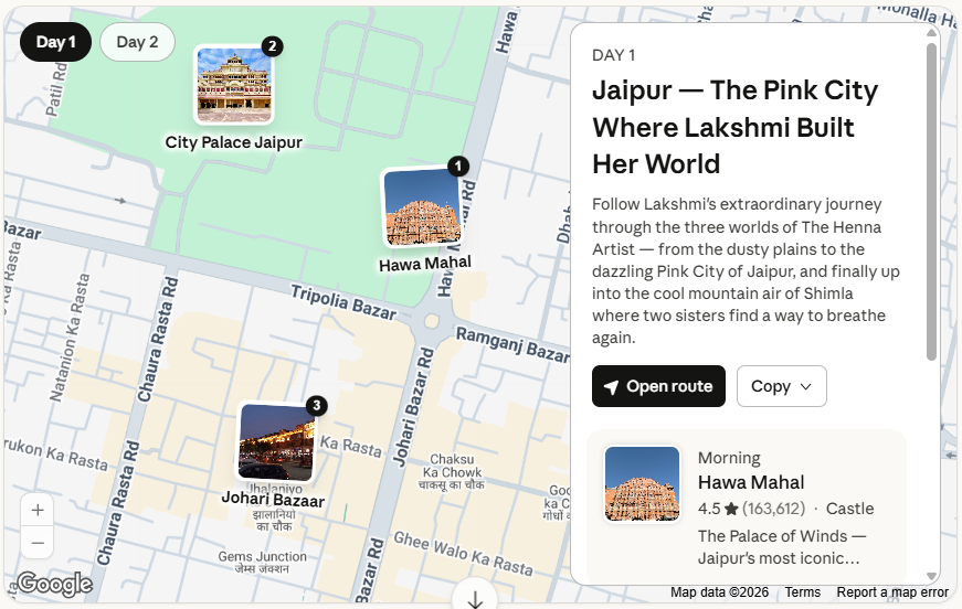 Johari Bazaar — Jaipur — Jaipur’s legendary jewellery and textile market, where Lakshmi moves from household to household, navigating the rhythms of old city life alongside Malik, the street-smart boy who becomes her protégé and guide. The market’s narrow lanes and riot of color are the sensory heartbeat of the novel’s Jaipur chapters.