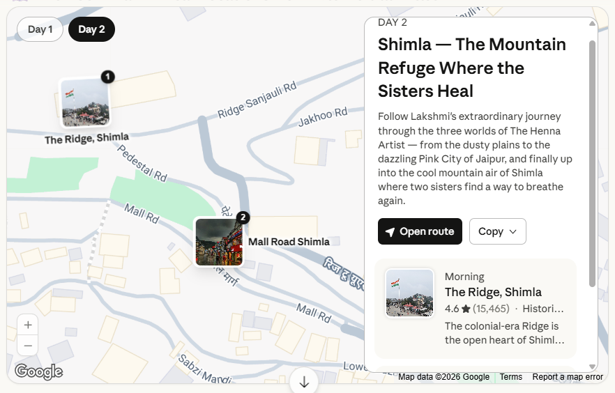 The Ridge — Shimla — The open colonial promenade overlooking the Himalayan foothills is where the novel’s tone shifts from the high-pressure, gossip-riven heat of Jaipur to something cooler, quieter, and full of the possibility of beginning again. Joshi’s family vacationed in Shimla, and she used both memory and family photographs when writing these chapters which is why they feel so tender and specific.