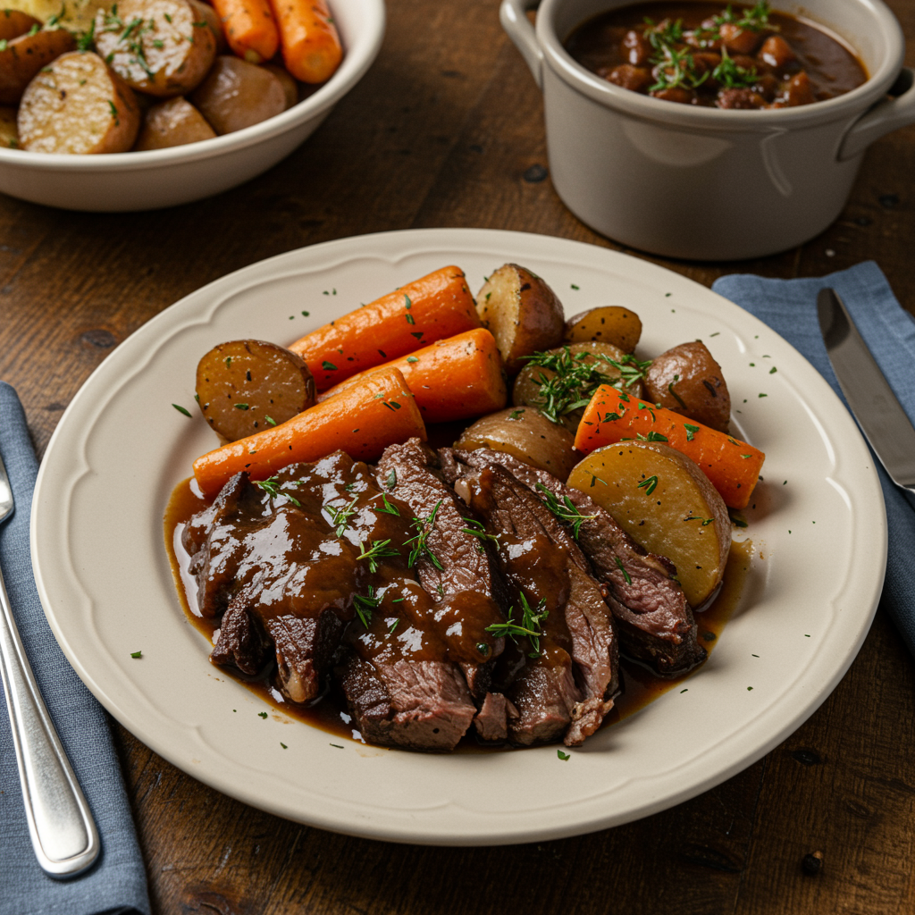 - Main: Slow-Roasted Pot Roast with Root Vegetables. A heavy, traditional family meal that sits in stark contrast to the volatile arguments about money and dementia happening around the table.