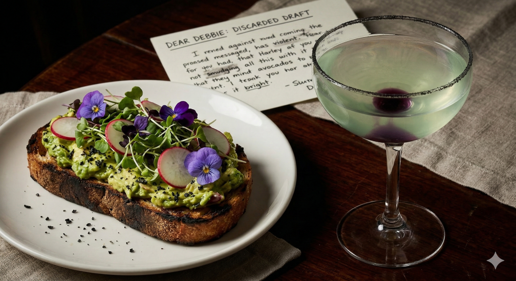 The provided image captures this pairing, which is defined by “Domestic Malice.” As described, the artisanal avocado sandwich (Image 4) is served on thick, charred sourdough, topped with vibrant radish and microgreens, and features those malicious purple micro-flowers that Debbie uses to poison Harley.