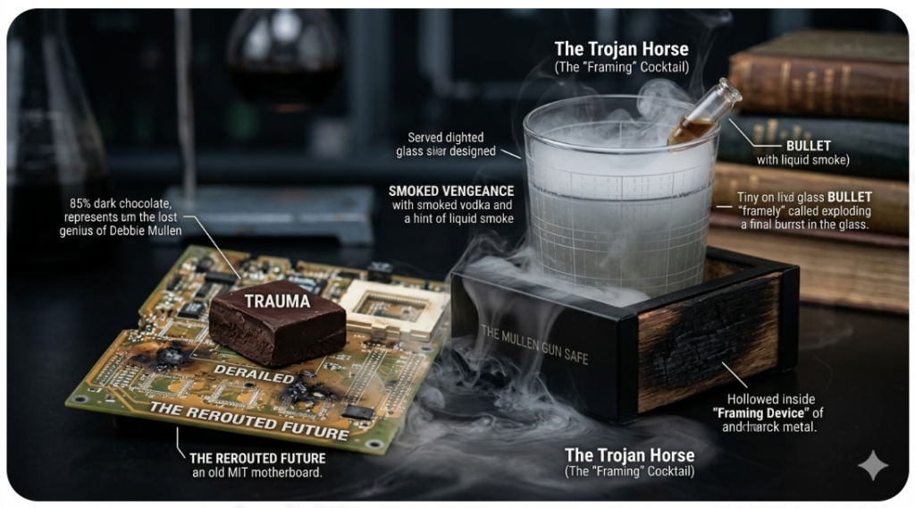 The Drink: The Trojan Horse (The “Framing” Cocktail) Served in a clear, modern glass designed like a digital code screen. The base is an “MIT Spirit” (a clean, clear vodka), mixed with “Smoked Vengeance” (liquid smoke, creating an opaque, cloudy grey liquid). It is served inside a hollowed-out “Framing Device” made of dark, charred wood and metal. When the drink is poured, it releases a cloud of literal smoke (representing the Ken Bryant execution). A tiny, stylized glass “Bullet” (labeled “THE GUN S SAFE”) containing the main ingredient (the smoke) is added, which “framely” explodes the smoke in the glass. This is the moment Debbie finally executes her code against Hutch.