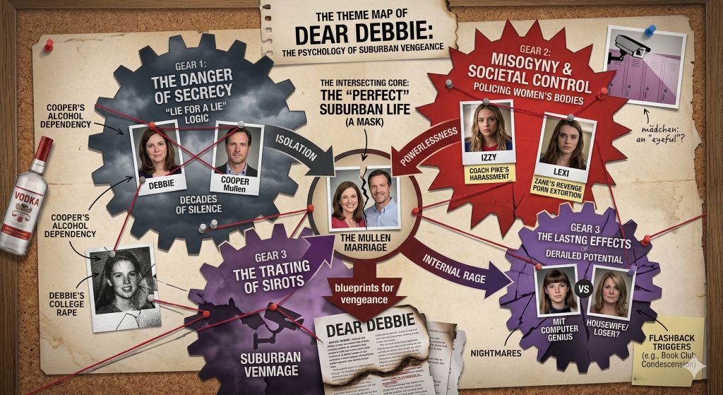 Here is the complete Theme Map for Dear Debbie, visualizing the blueprint I described above. I designed it to look like a messy investigation board, showing how the three core themes function like interlocking gears.