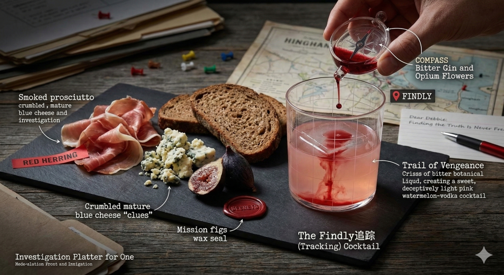The Drink: The Findly (The “Tracking” Cocktail) Served in a clear, modern glass designed like a map grid. The base is an “Honest Vodka” and fresh watermelon juice, creating a deceptively light and cheerful pink liquid. The key is the presentation: it is served with a small, stylized glass “Compass” (labeled “FINDLY”) containing “Bitter Gin” and “Opium Flowers” (bitter botanical notes, representing the toxicity Debbie hides). The drinker is meant to “track” the sweet watermelon base by adding drops from the bitter compass, creating a crimson “Trail of Vengeance” in the glass. It symbolizes the tracking app that forces the truth to light.